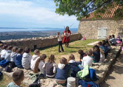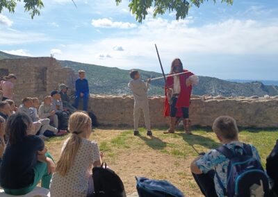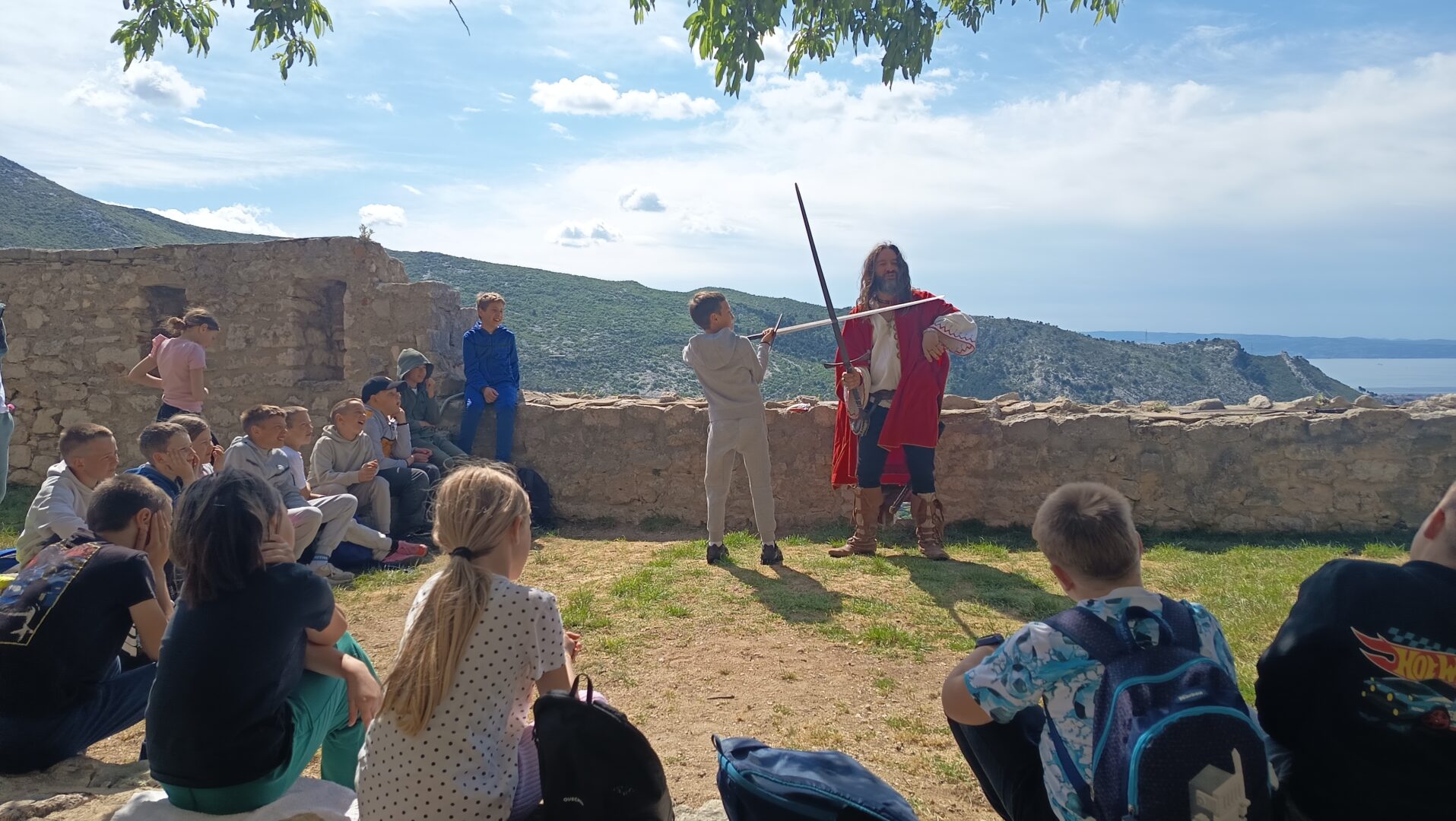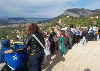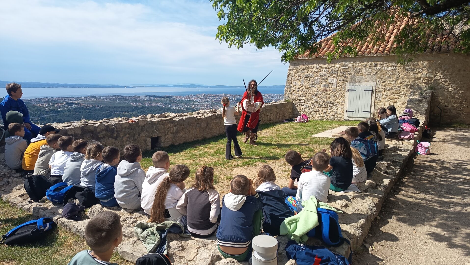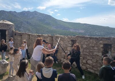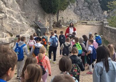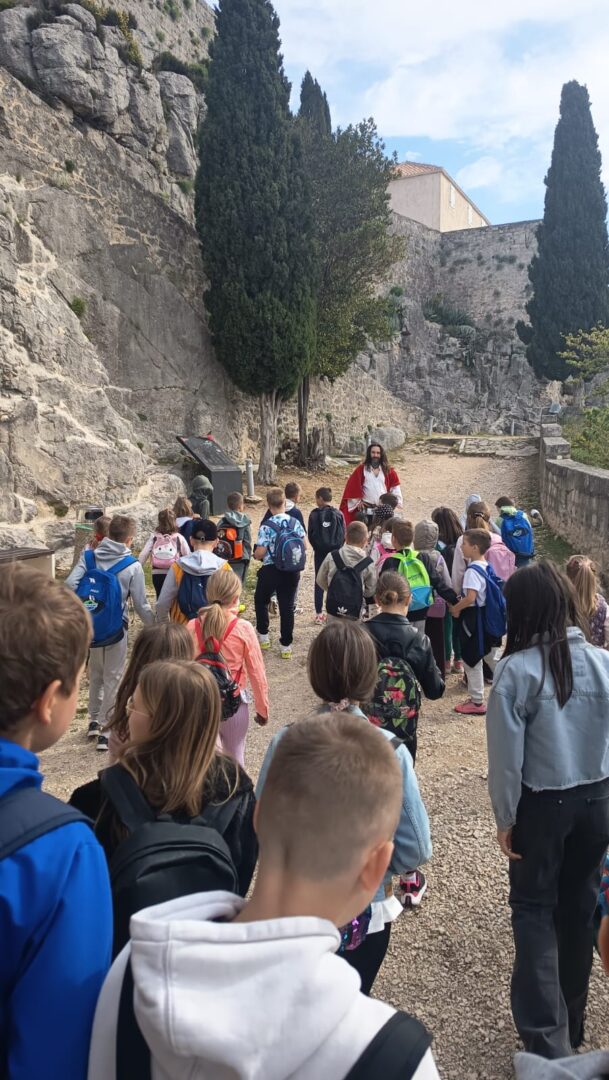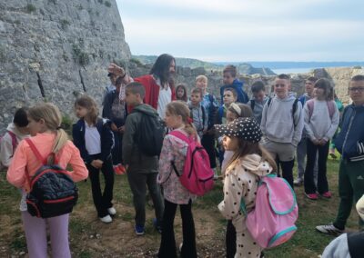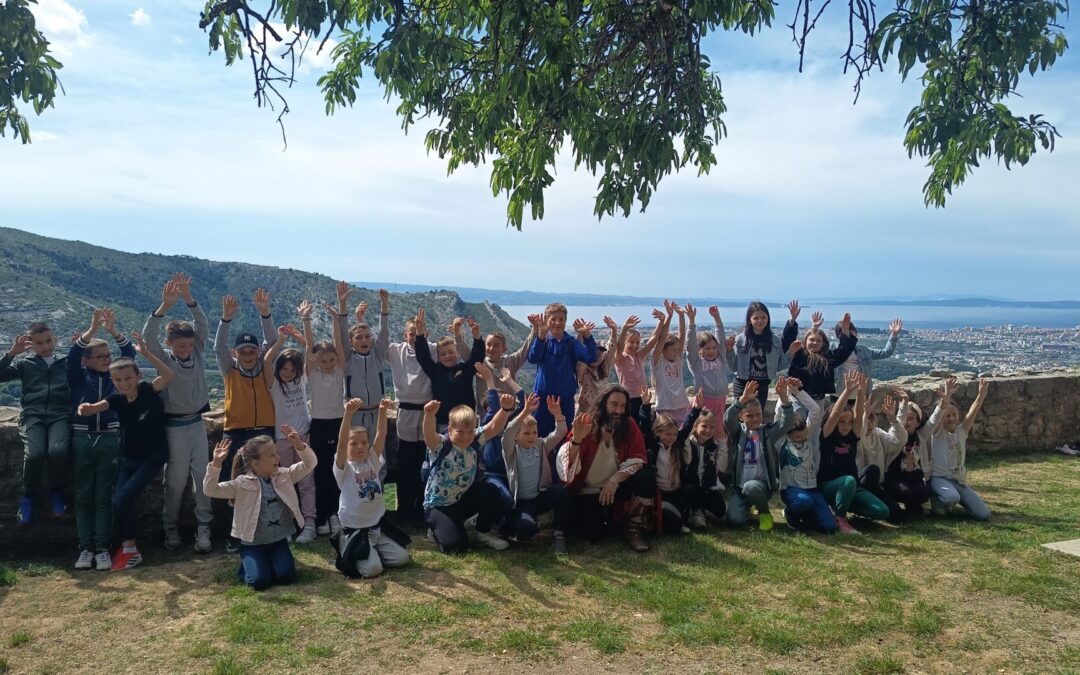 Čim su stigli krenuli su prema tvrđavi. Ispred tvrđave su imali prekrasan pogled na grad Split i okolicu. Ušli su u tvrđavu gdje ih je dočekao vodič odjeven u kliškog uskoka. Krenuli su u obilazak tvrđave. Prolazili su kroz puno tunela i prolaza. Upoznali su mjesta s kojeg se pucalo kad su se branili od neprijatelja. Obišli su u muzej i razgledali oružje koje se koristilo u prošlosti. Posjetili su i crkvicu sv. Vida. Nakon obilaska sjeli su na klupice i travnjak te odmorili i marendali. Nakon kratke stanke učili su tehnike mačevanja. Vodič je donio luk i strijelu pa su učenici vježbali gađati metu. Jako su im se svidjele te stare viteške igre. Nakon zabavne igre stiglo je vrijeme povratka. Kući su stigli u 13 sati.